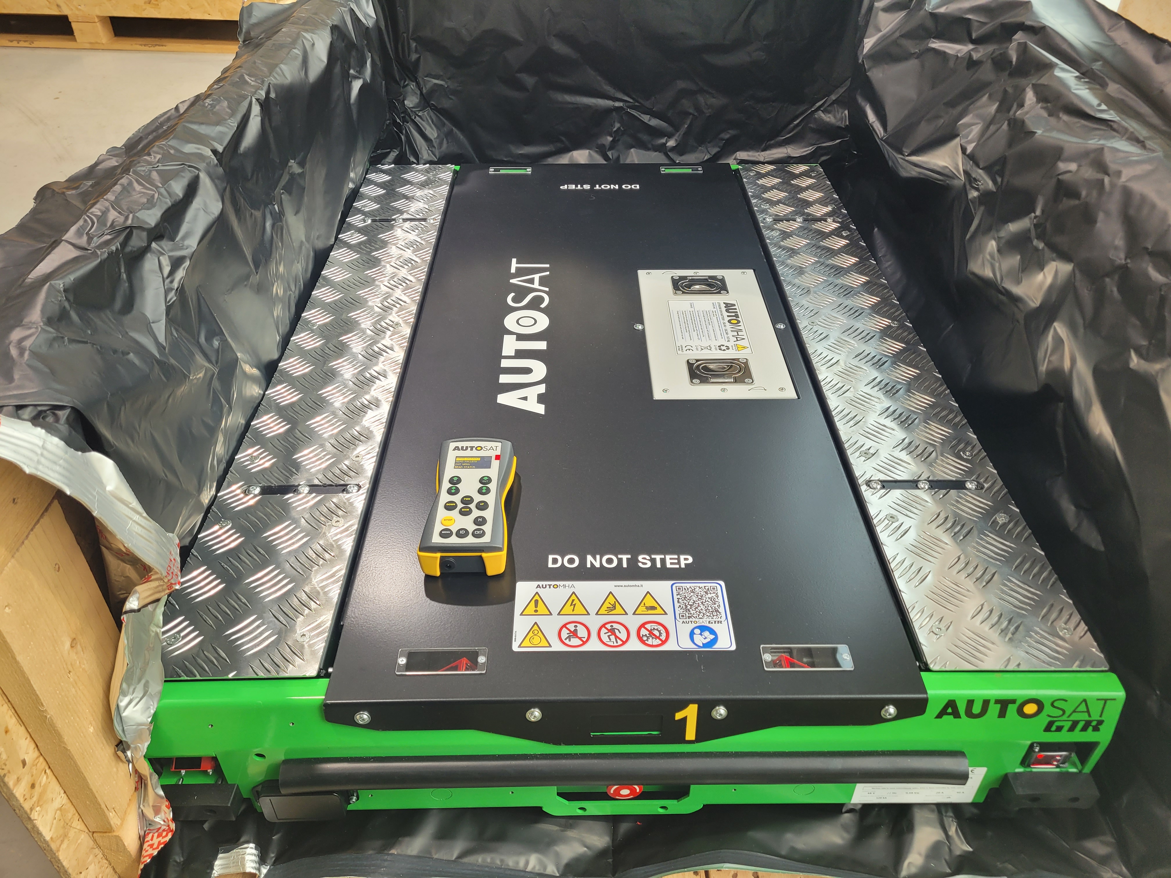 수동 : 지게차로 레일 위에 올려주면 셔틀이 자동으로 적재물을 감지해 입구까지 이동